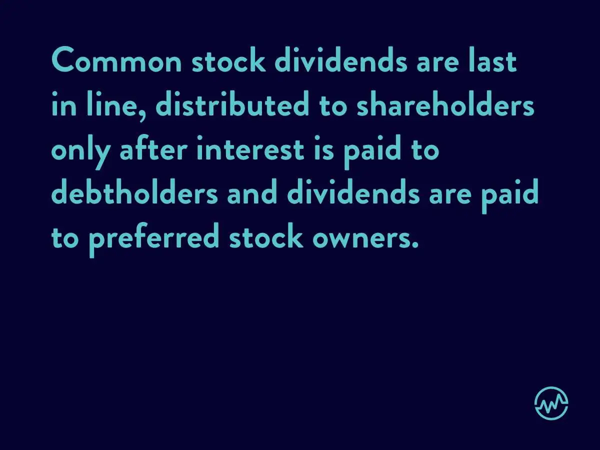 Firms are under no obligation to pay dividends on common stock. If you are a common stock owner, you can expect a higher return on investment compared to debt holders and preferred stock owners (which we’ll discuss next) for taking on additional risk by receiving payments last behind other shareholders.